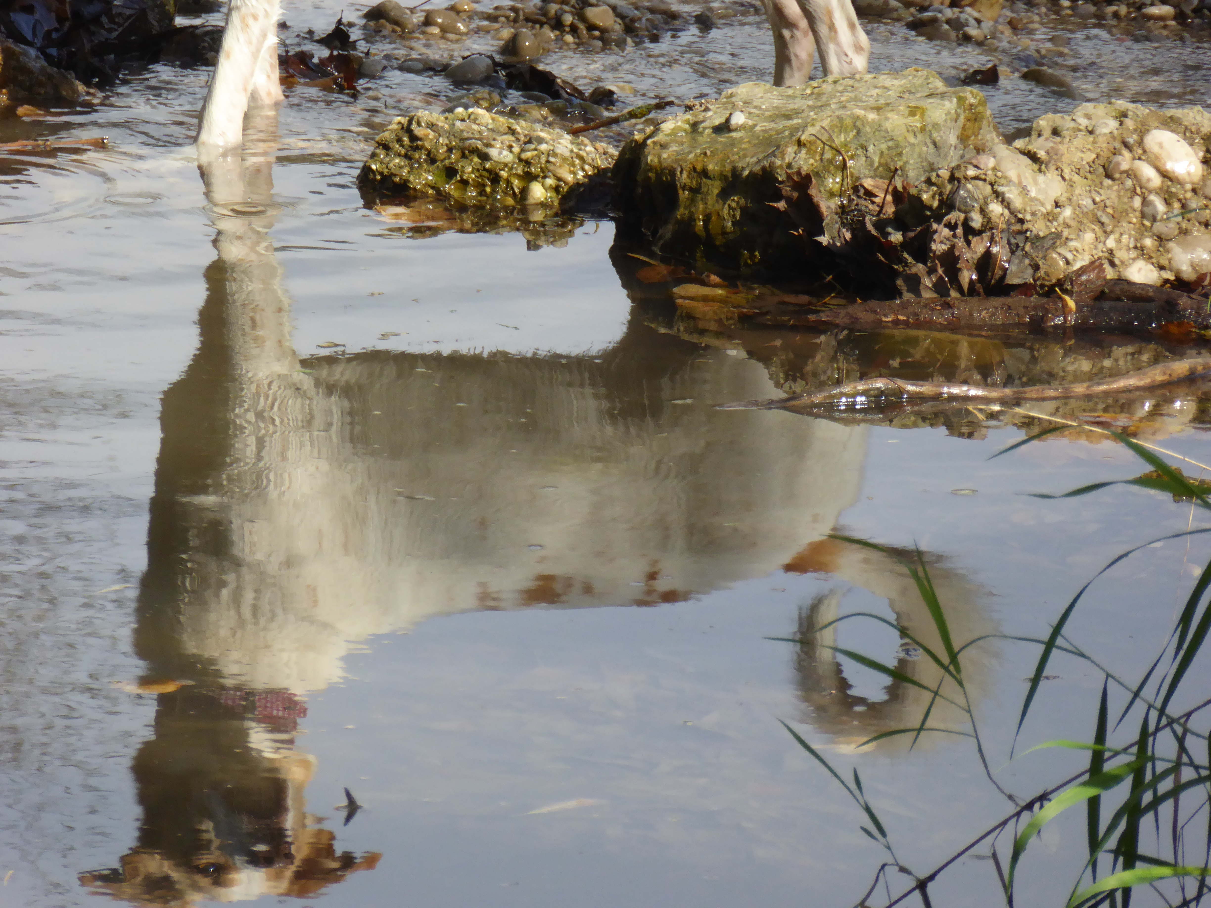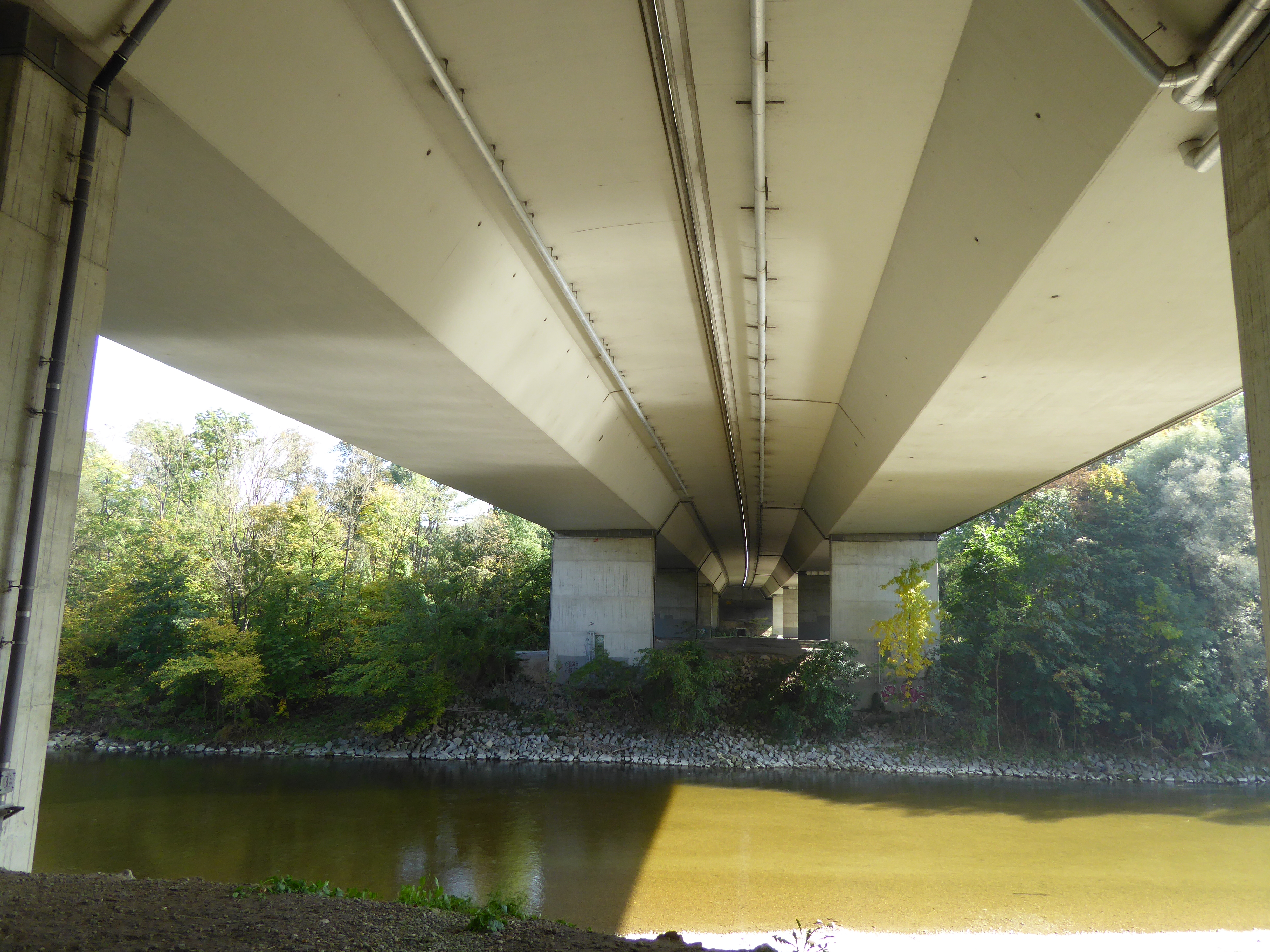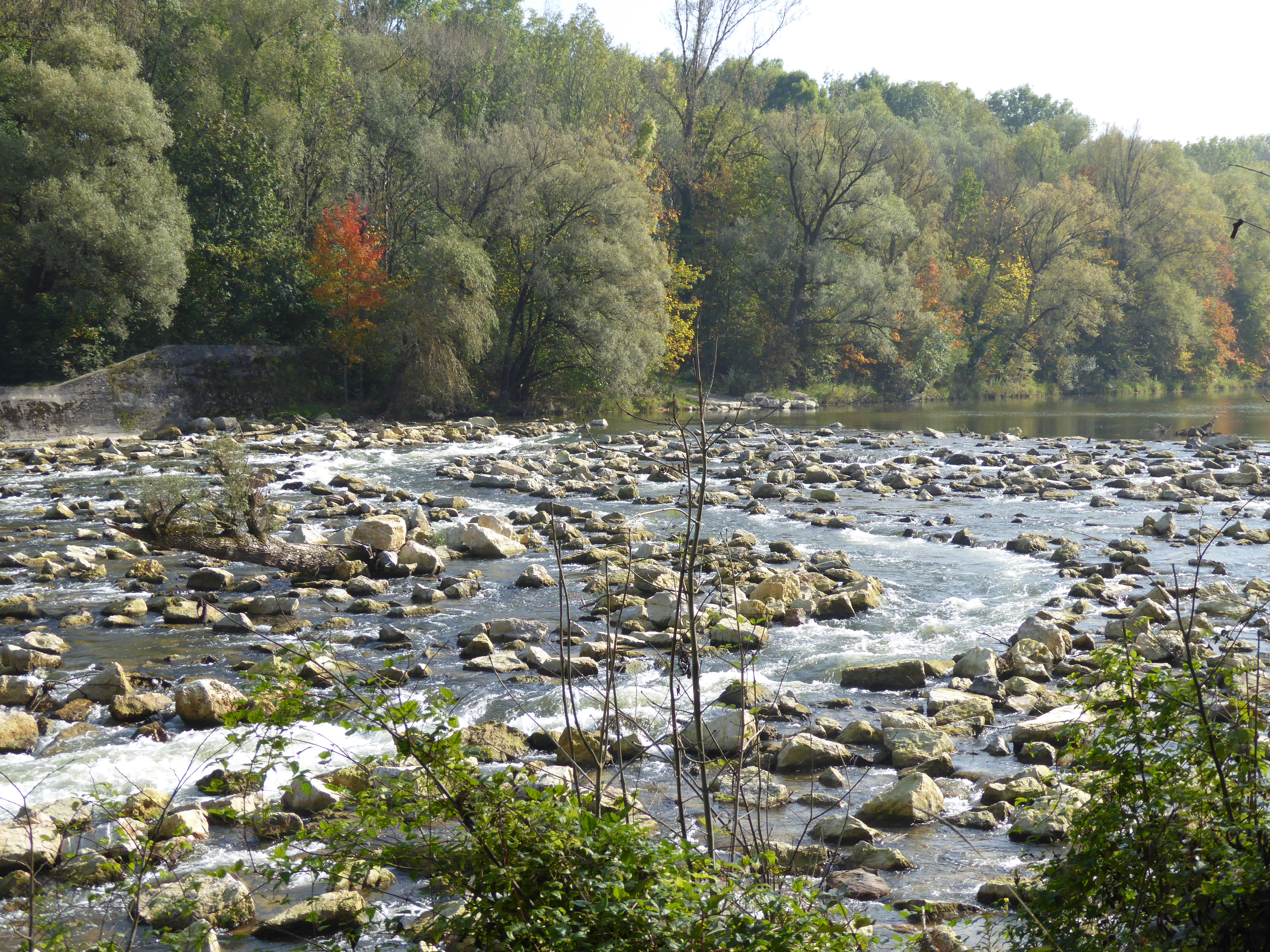 Die Sonne kommt raus, die telefonierenden Hundehalten erzählen was von „Die Wiesnwirte haben ja immer schönes Wetter“ und wir kommen zum Autobahnring. Kurz davor das frühere Wehr Unterföhring. Jetzt nur noch eine steinige Abstufung der Isar. Riesige Bäume haben sich dort verhakt und warten auf das nächste Hochwasser.