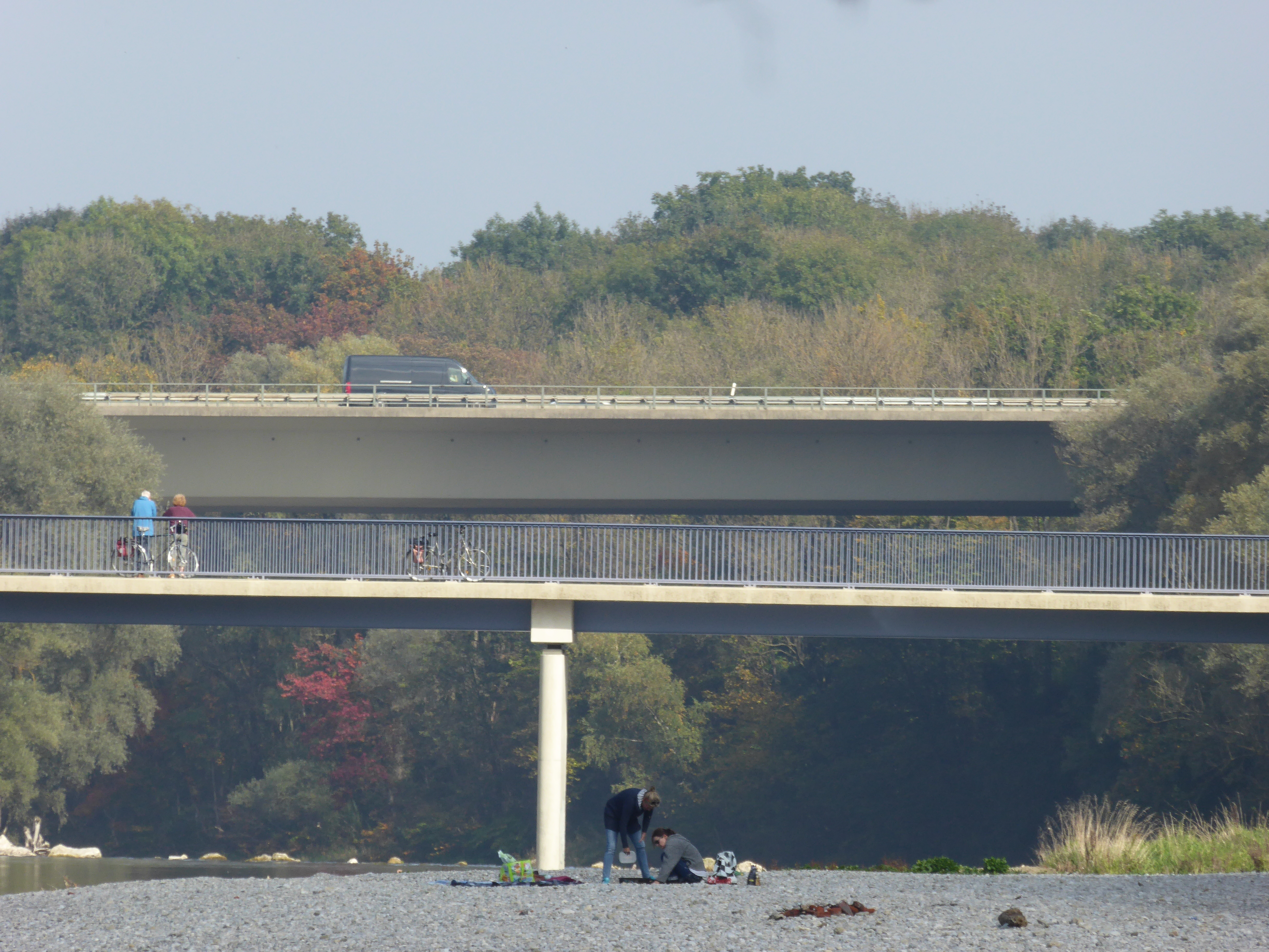 Warm wird’s und es geht zäh voran. Etwas eintönig der Weg: Links Auwald, rechts Gebüsch und 4 Meter unter uns die bräunliche Isar. Wir freuen uns über jede Abwechslung, hier ungefähr auf Höhe Ismaning.